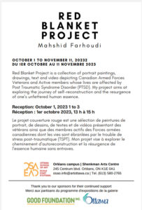 Post Traumatic Stress disorder (PTSD) from military service has also impacted my family and loved ones. I know first-hand how PTSD can strip an individual, a family or a community of purpose, quality of life, and hope. As an Artist, and survivor of PTSD, I have committed to working with many Veterans from Across Canada by painting their portrait in what has become known as the Red Blanket Project.