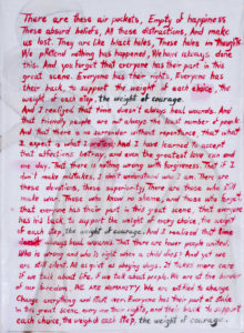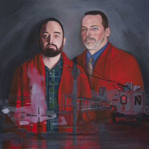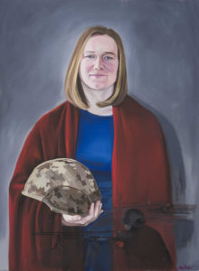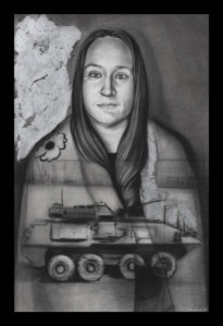 The portraits are Self-represented without wearing their uniform. They are dressed casually as they are in their recovery and treatments, and covered with a red blanket, which symbolizes courage, passion, and life force (resilience). The integrations of symbols as shadows represents trades or branches and or anything that connects to the personal story of the person depicted in the artwork.